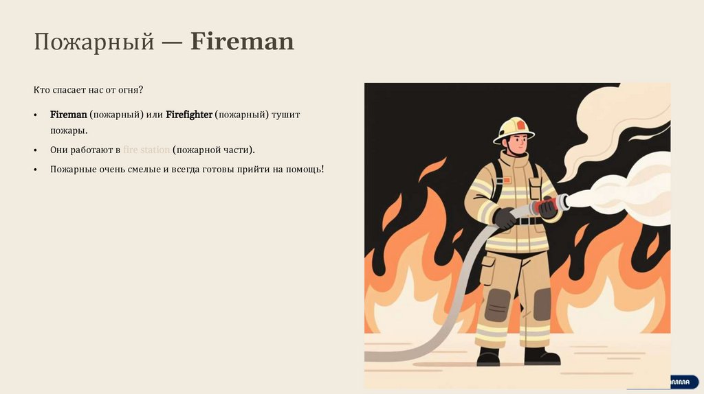 Fireman (пожарный) или Firefighter (пожарный) тушит