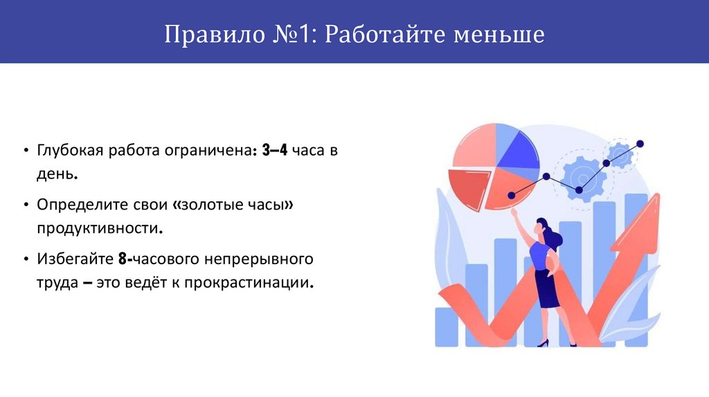 Правило №1: Работайте меньше• Глубокая работа ограничена: 3–4 часа в