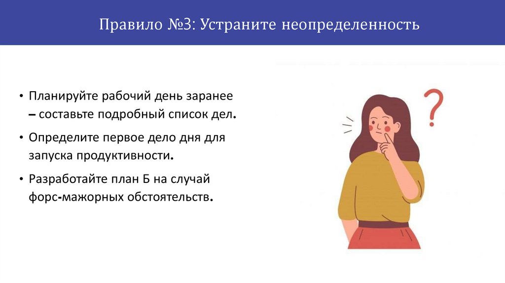 • Планируйте рабочий день заранее– составьте подробный список дел.
