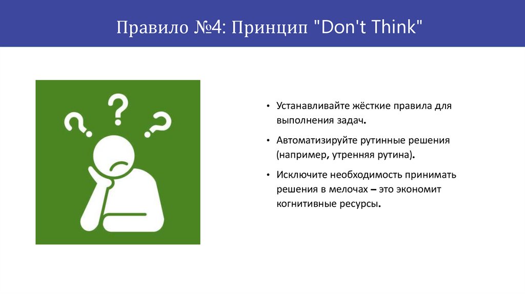 Правило №4: Принцип "Don't Think"• Устанавливайте жёсткие правила для