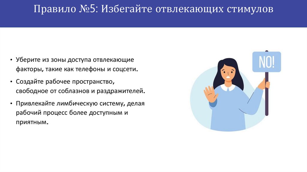 • Уберите из зоны доступа отвлекающиефакторы, такие как телефоны и соцсети.