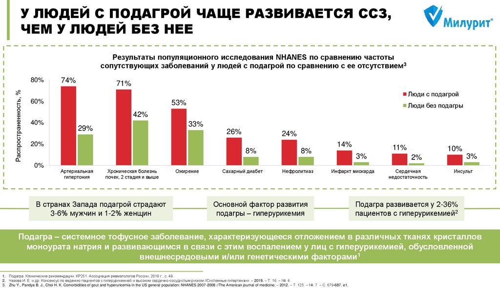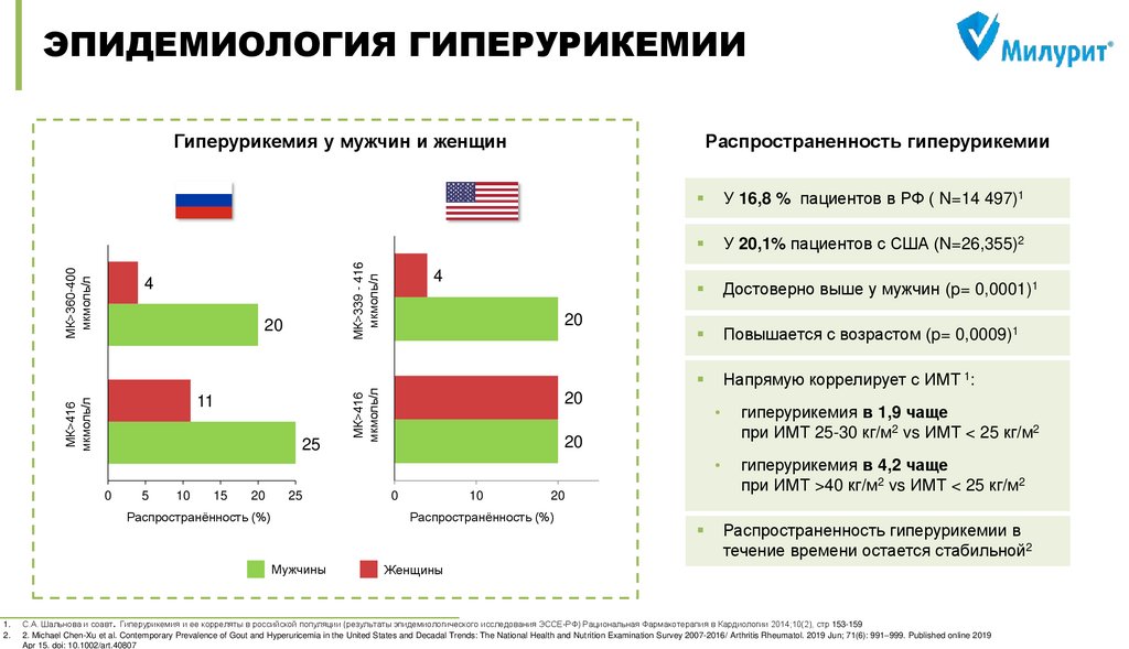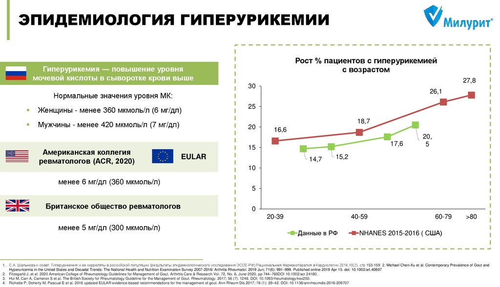 1. С.А. Шальнова и соавт. Гиперурикемия и ее корреляты в российской популяции (результаты эпидемиологического исследования ЭССЕ-РФ) Рациональная Фармакотерапия в Кардиологии 2014;10(2), стр 153-159 2. Michael Chen-Xu et al. Contemporary Prevalence of Gout and