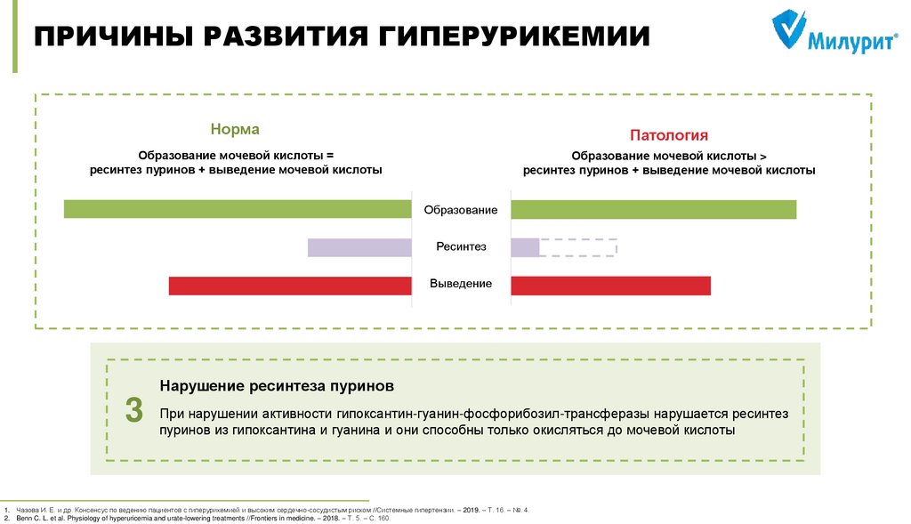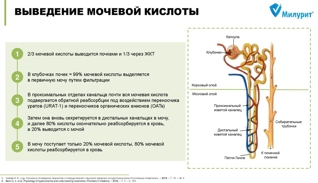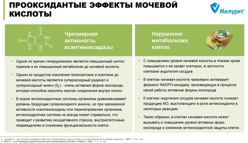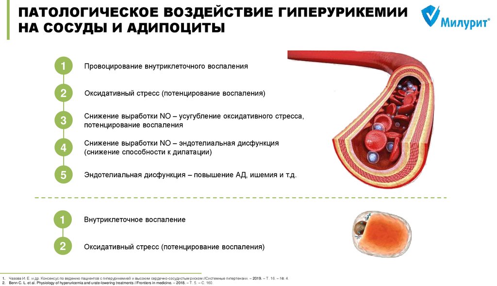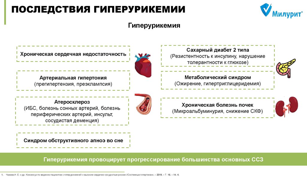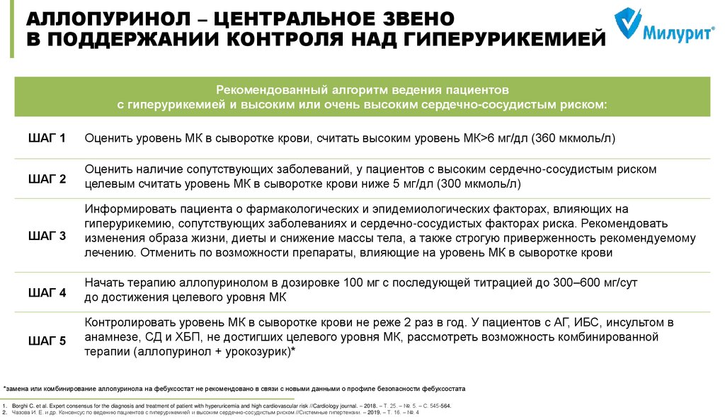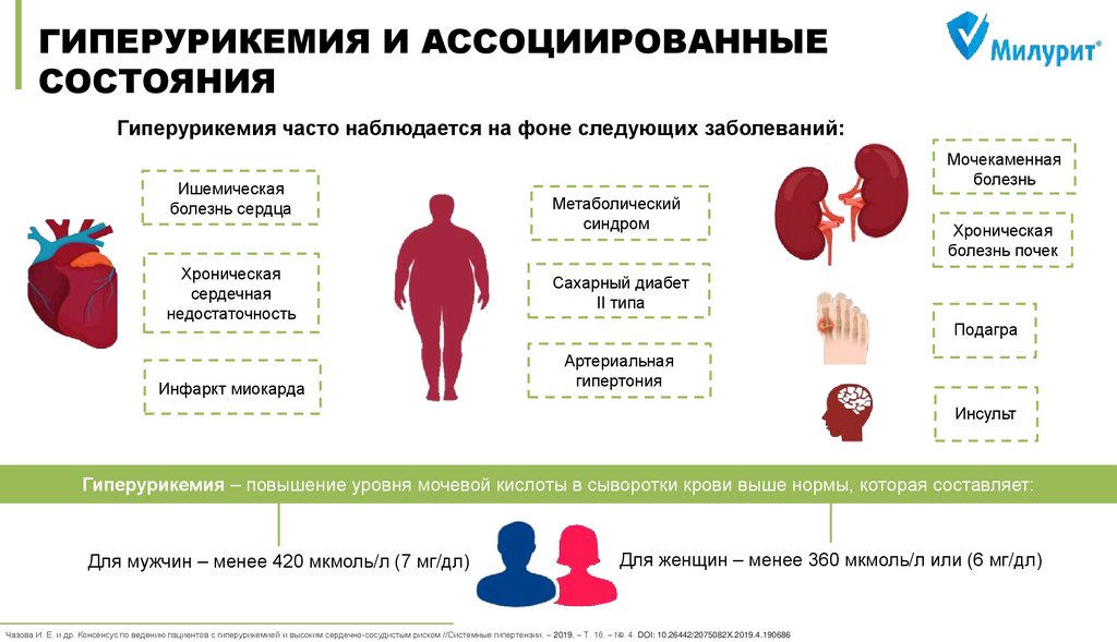 Чазова И. Е. и др. Консенсус по ведению пациентов с гиперурикемией и высоким сердечно-сосудистым риском //Системные гипертензии. – 2019. – Т. 16. – №. 4. DOI: 10.26442/2075082X.2019.4.190686