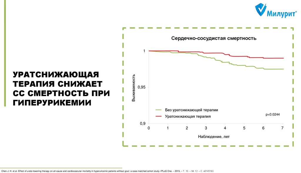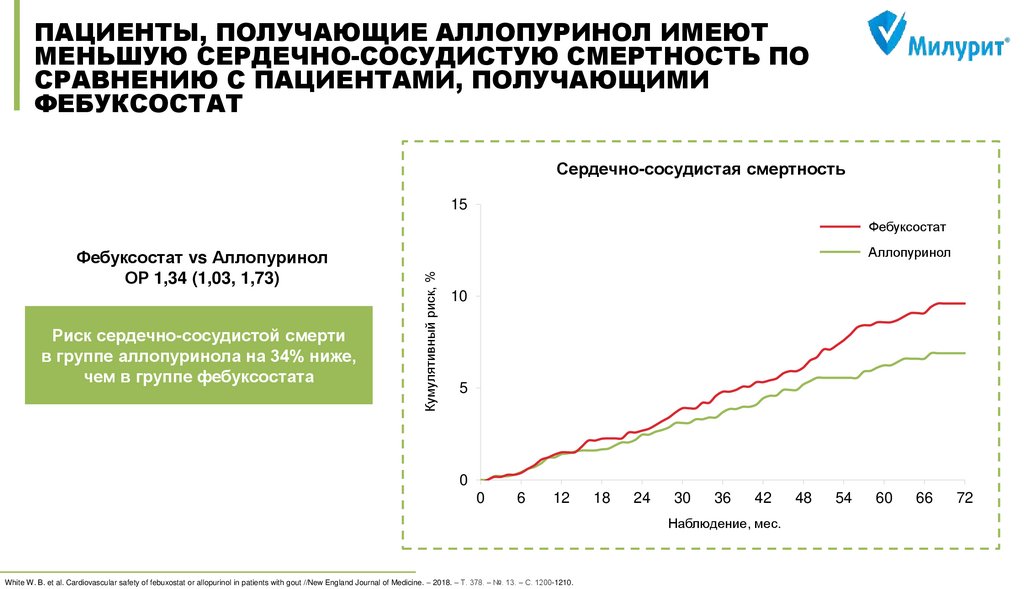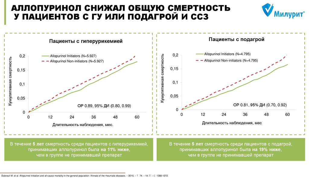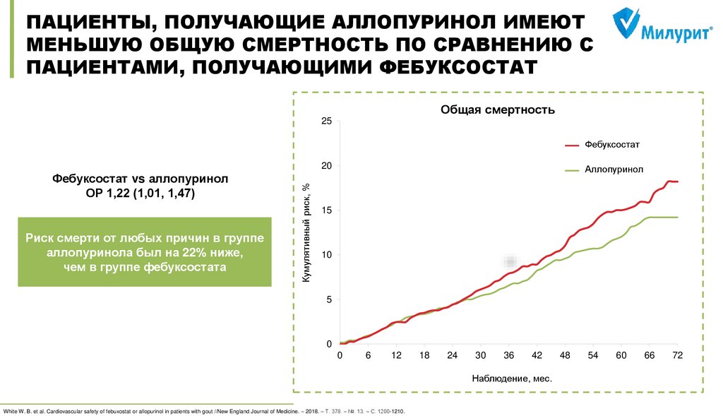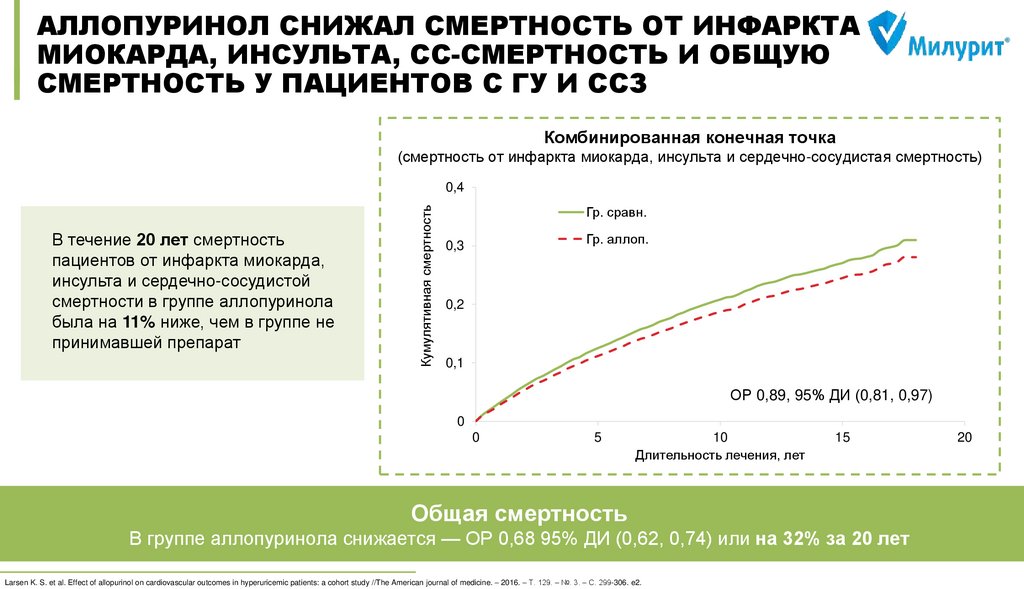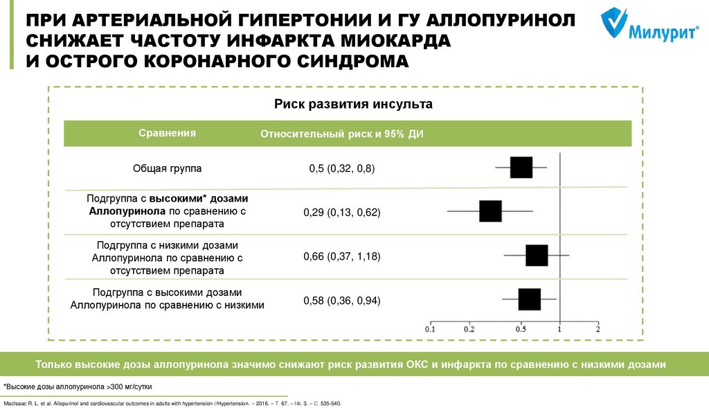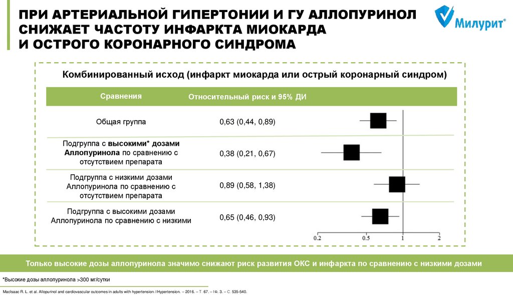 all-cause mortality in the general population //Annals of the rheumatic diseases. – 2015. – Т. 74. – №. 7. – С. 1368-1372. 3) MacIsaac R. L. et al. Allopurinol and cardiovascular outcomes in adults with hypertension //Hypertension. – 2016. – Т. 67. – №. 3. – С. 535-540. 4) Wei L. et al. Association