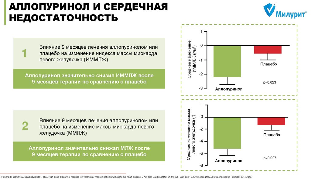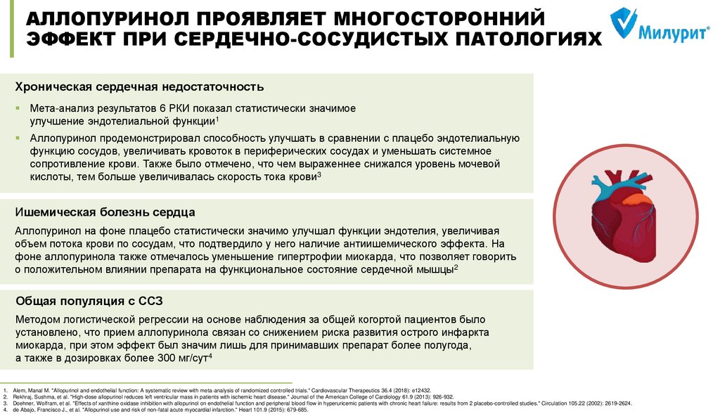 between allopurinol and mortality in heart failure patients: a long‐term follow‐up study //International journal of clinical practice. – 2009. – Т. 63. – №. 9. – С. 1327-1333 5) Doehner W, Schoene N, Rauchhaus M, et al. Effects of xanthine oxidase inhibition with allopurinol on endothelial function and