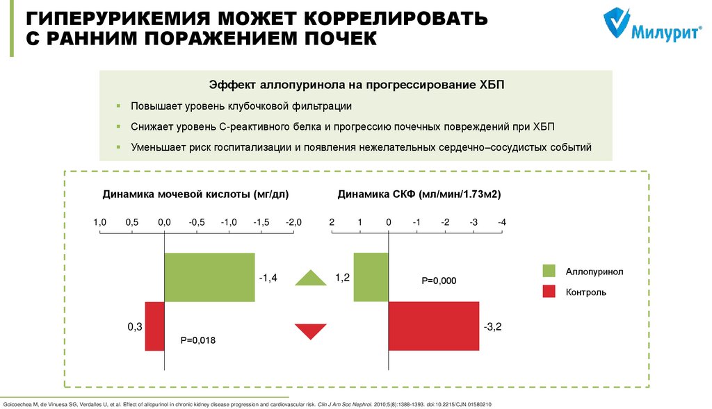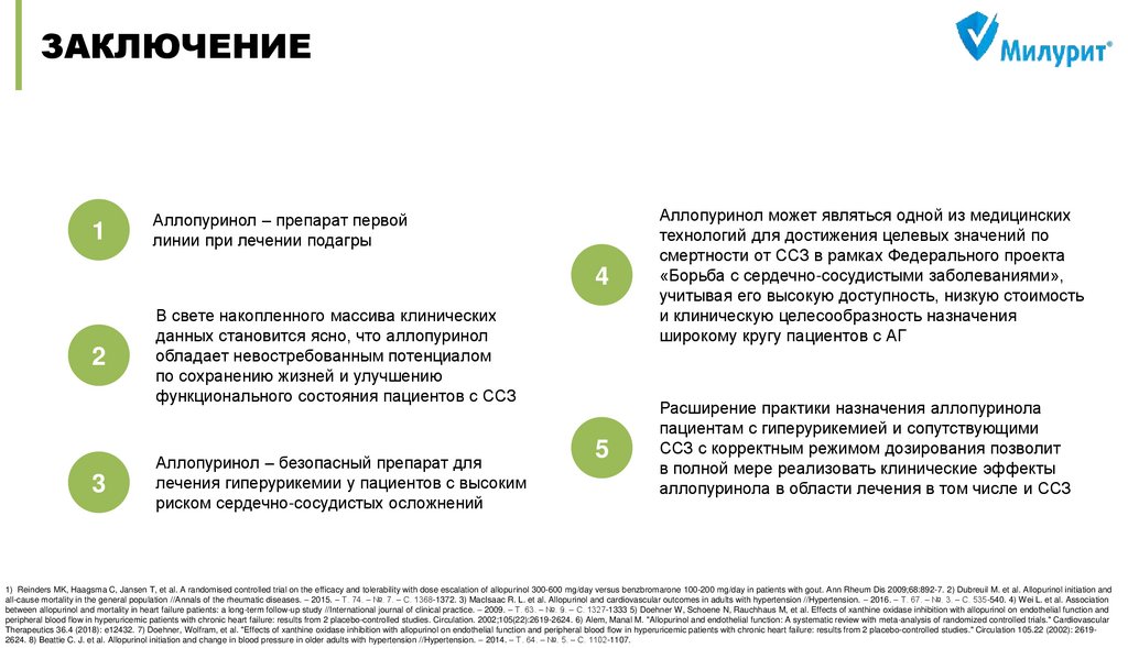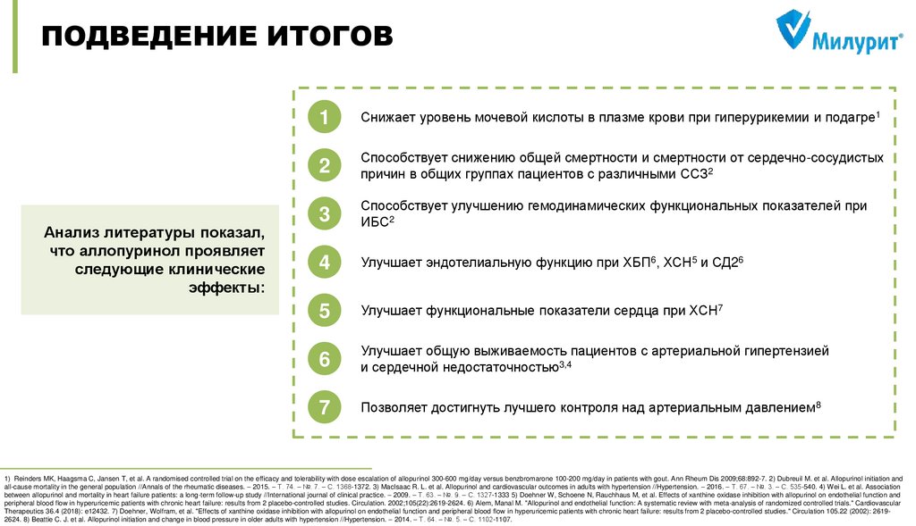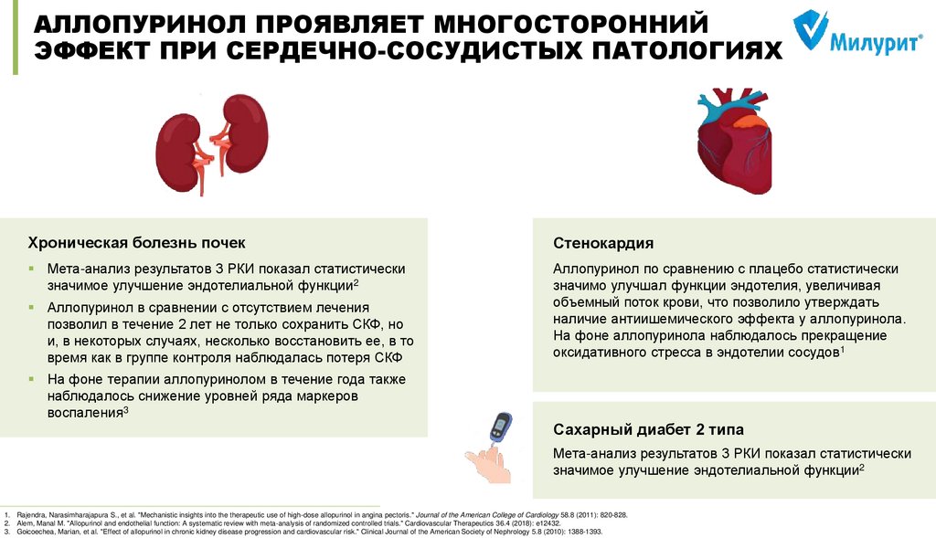 Therapeutics 36.4 (2018): e12432. 7) Doehner, Wolfram, et al. "Effects of xanthine oxidase inhibition with allopurinol on endothelial function and peripheral blood flow in hyperuricemic patients with chronic heart failure: results from 2 placebo-controlled studies." Circulation 105.22 (2002): 26192624. 8) Beattie C. J. et al. Allopurinol initiation and change in blood pressure in older adults with hypertension //Hypertension. – 2014. – Т. 64. – №. 5. – С. 1102-1107.