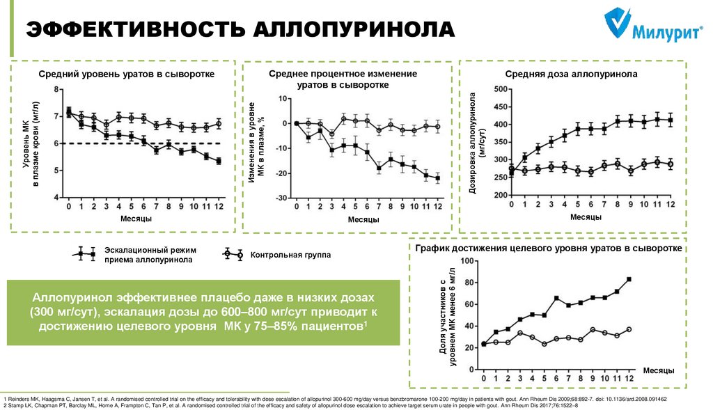 1) Reinders MK, Haagsma C, Jansen T, et al. A randomised controlled trial on the efficacy and tolerability with dose escalation of allopurinol 300-600 mg/day versus benzbromarone 100-200 mg/day in patients with gout. Ann Rheum Dis 2009;68:892-7. 2) Dubreuil M. et al. Allopurinol initiation and