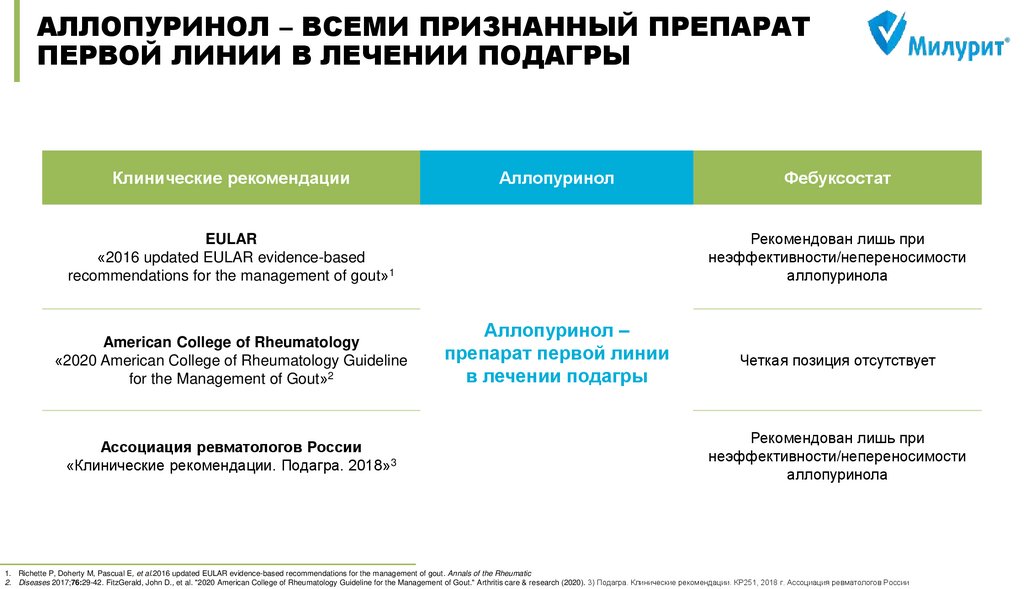 4. Richette P, Doherty M, Pascual E et al. 2016 updated EULAR evidence-based recommendations for the management of gout. Ann Rheum Dis 2017; 76 (1): 29–42. DOI: 10.1136/annrheumdis-2016-209707