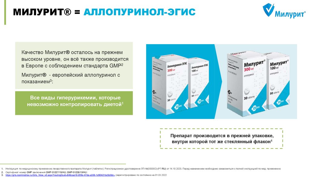 МИЛУРИТ® = АЛЛОПУРИНОЛ-ЭГИСКачество Милурит® осталось на прежнем