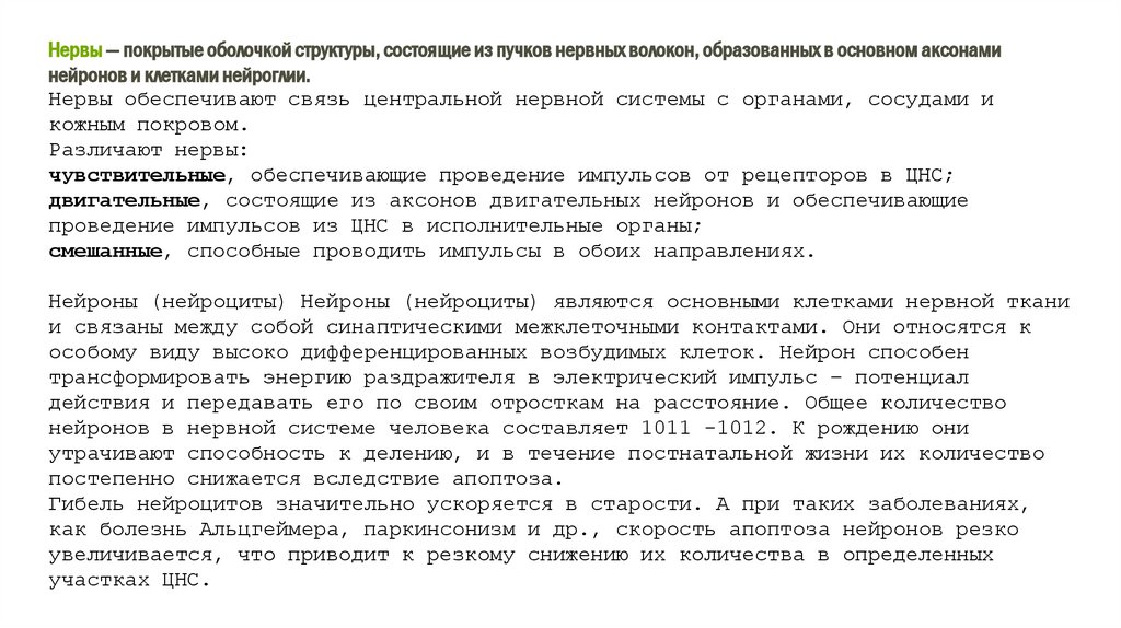 Нервы — покрытые оболочкой структуры, состоящие из пучков нервных волокон, образованных в основном аксонаминейронов и клетками нейроглии.