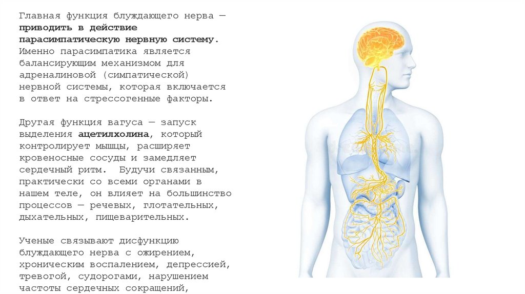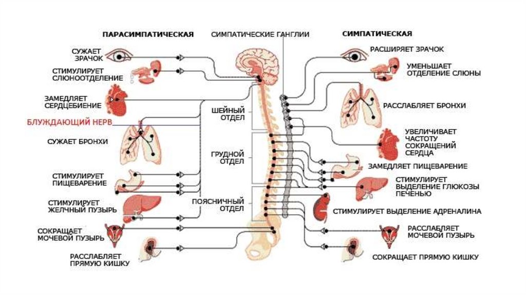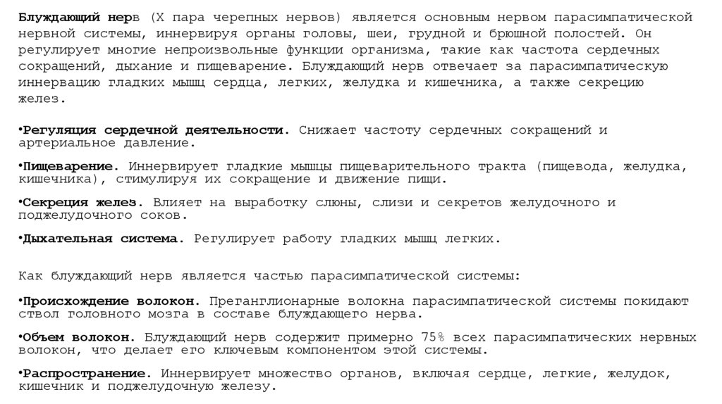 сокращений, дыхание и пищеварение. Блуждающий нерв отвечает за парасимпатическую