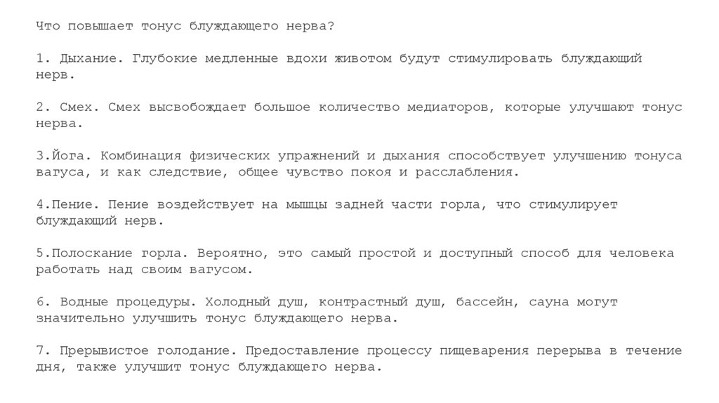 Что повышает тонус блуждающего нерва?1. Дыхание. Глубокие медленные вдохи животом будут стимулировать блуждающий