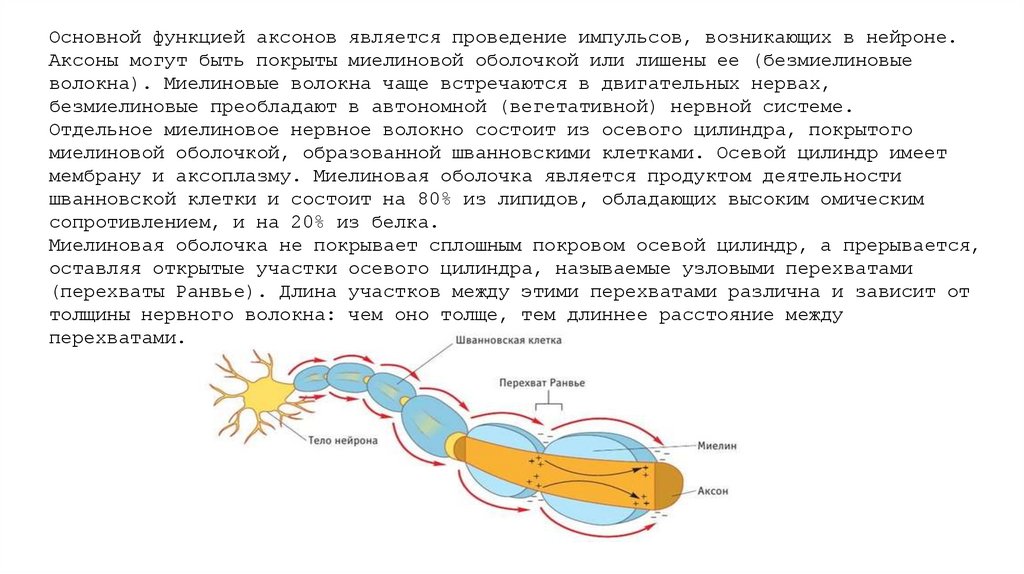 Основной функцией аксонов является проведение импульсов, возникающих в нейроне.Аксоны могут быть покрыты миелиновой оболочкой или лишены ее (безмиелиновые