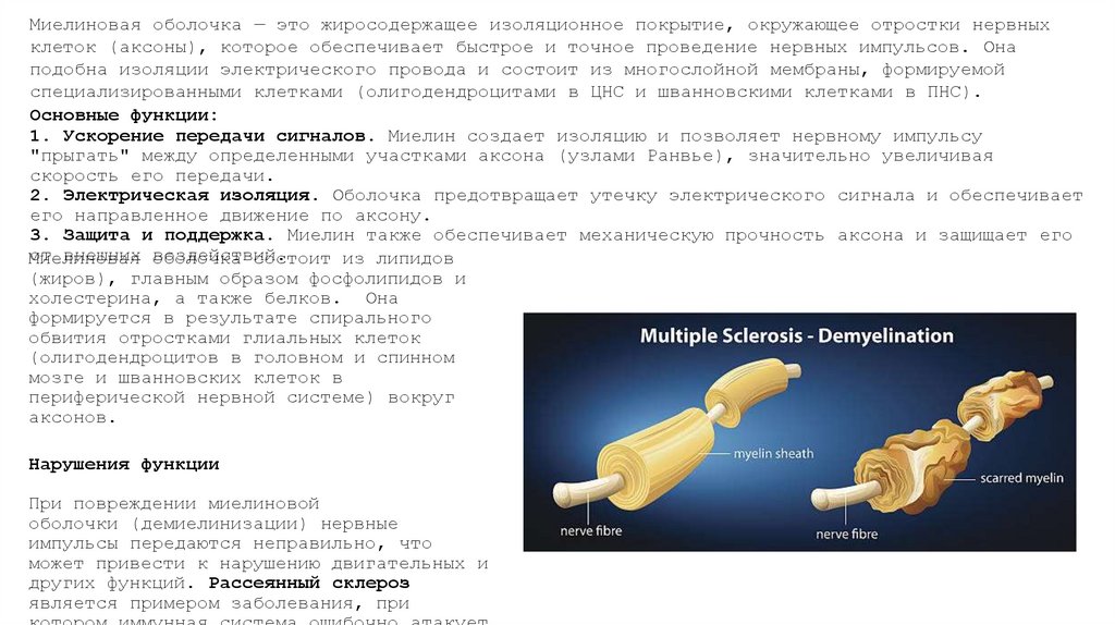 Миелиновая оболочка — это жиросодержащее изоляционное покрытие, окружающее отростки нервныхклеток (аксоны), которое обеспечивает быстрое и точное проведение нервных импульсов. Она