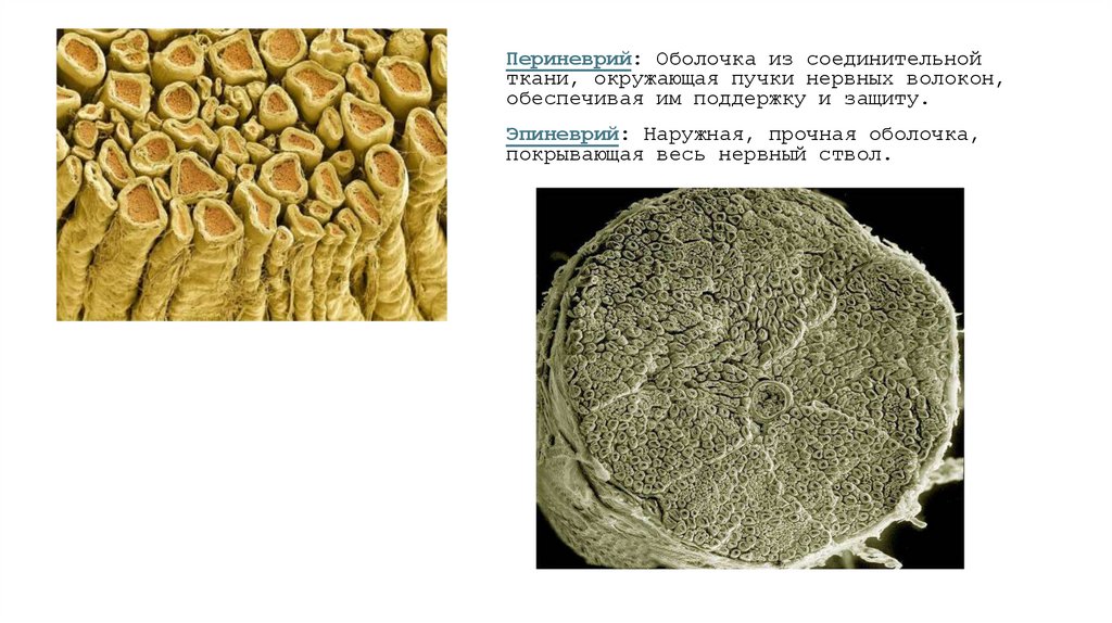 Периневрий: Оболочка из соединительнойткани, окружающая пучки нервных волокон,