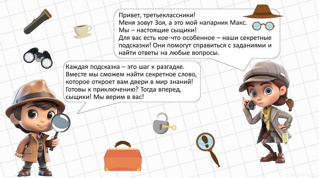 Привет, третьеклассники!Меня зовут Зоя, а это мой напарник Макс.
