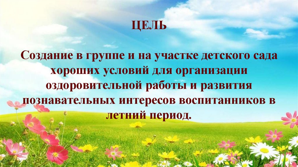 2. ЦЕЛЬ Создание в группе и на участке детского сада хороших условий для организации оздоровительной работы и развития