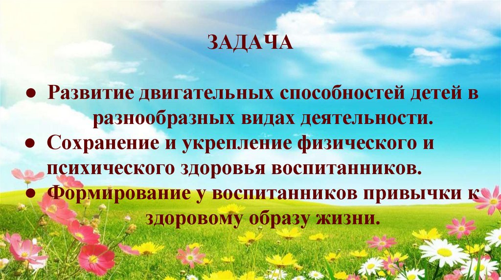 3. ЗАДАЧА Развитие двигательных способностей детей в разнообразных видах деятельности. Сохранение и укрепление физического и