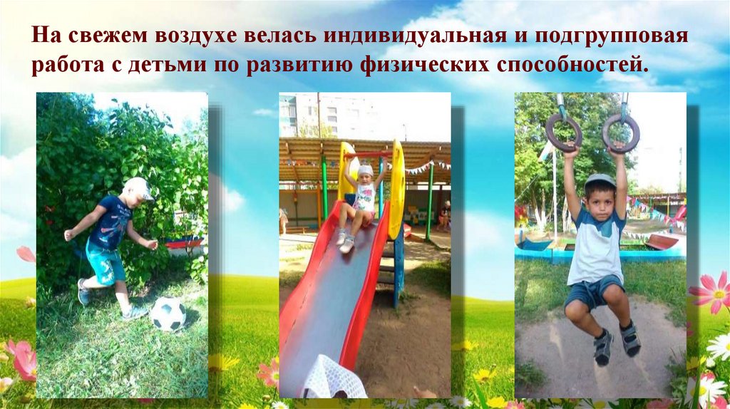 5. На свежем воздухе велась индивидуальная и подгрупповая работа с детьми по развитию физических способностей.
