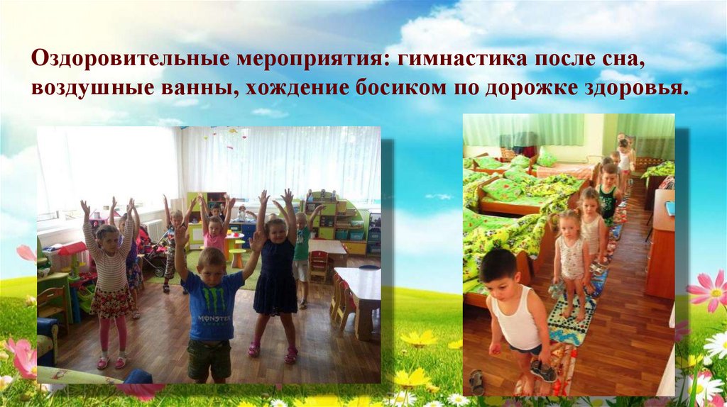 8. Оздоровительные мероприятия: гимнастика после сна, воздушные ванны, хождение босиком по дорожке здоровья.