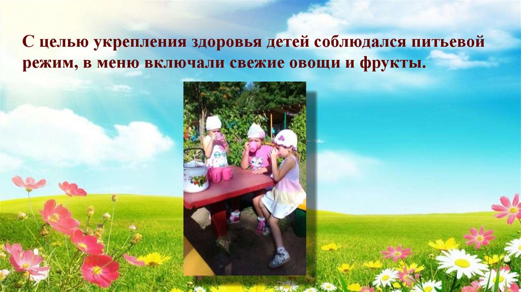 9. С целью укрепления здоровья детей соблюдался питьевой режим, в меню включали свежие овощи и фрукты.