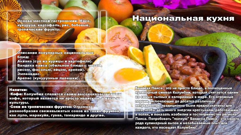 Основа местной гастрономии: Мясо,кукуруза, картофель, рис, бобовые,