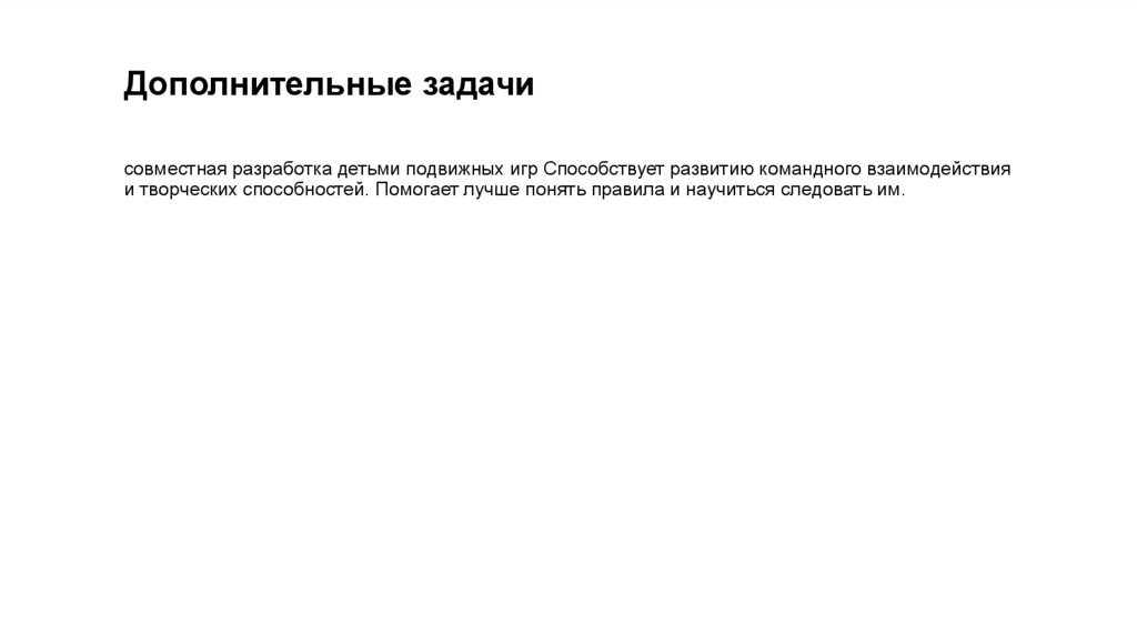 Дополнительные задачисовместная разработка детьми подвижных игр Способствует развитию командного взаимодействия