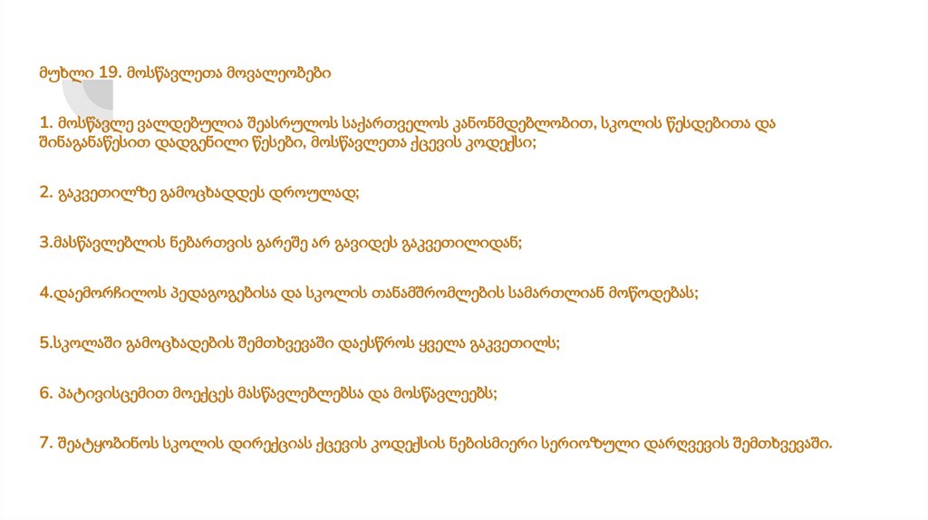 მუხლი 19. მოსწავლეთა მოვალეობები1. მოსწავლე ვალდებულია შეასრულოს საქართველოს კანონმდებლობით, სკოლის წესდებითა და
