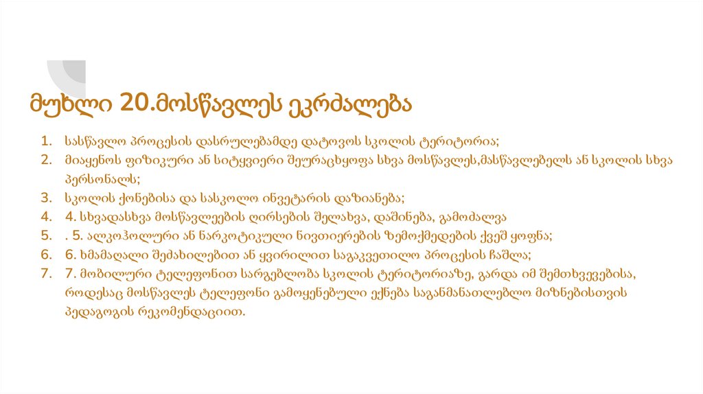 მუხლი 20.მოსწავლეს ეკრძალება1. სასწავლო პროცესის დასრულებამდე დატოვოს სკოლის ტერიტორია;