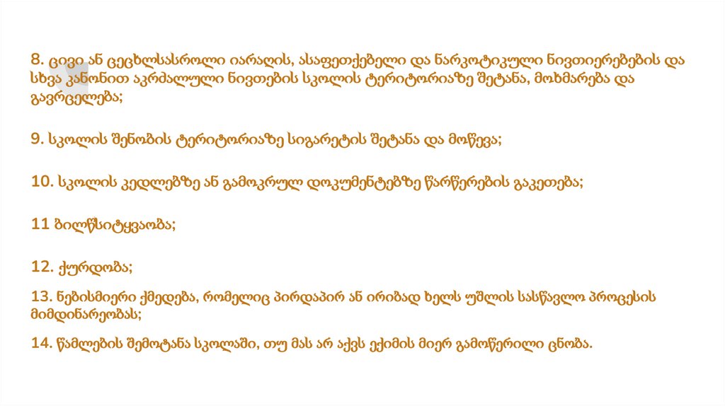 8. ცივი ან ცეცხლსასროლი იარაღის, ასაფეთქებელი და ნარკოტიკული ნივთიერებების დასხვა კანონით აკრძალული ნივთების სკოლის ტერიტორიაზე შეტანა, მოხმარება და