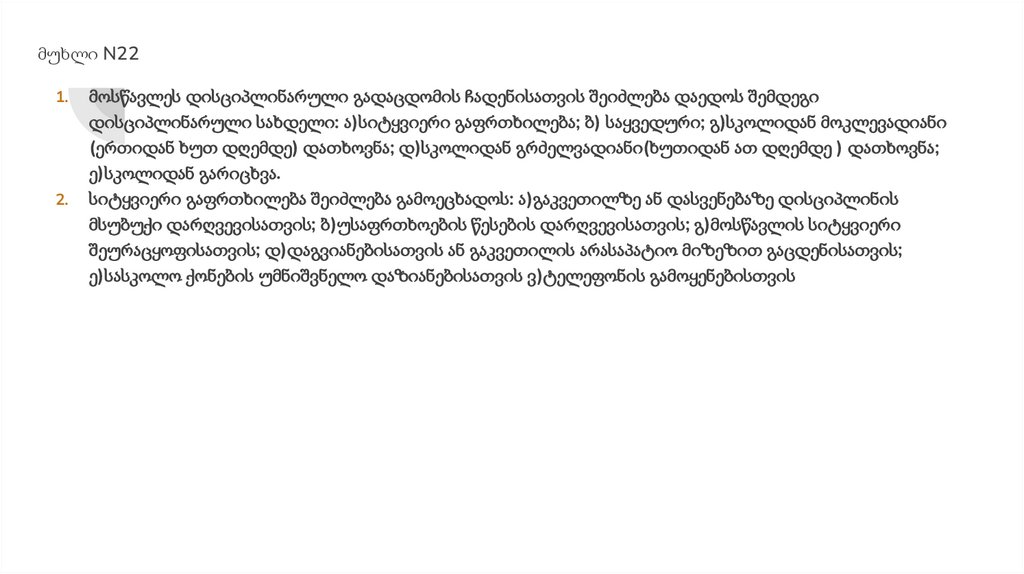 სიტყვიერი გაფრთხილება შეიძლება გამოეცხადოს: ა)გაკვეთილზე ან დასვენებაზე დისციპლინის