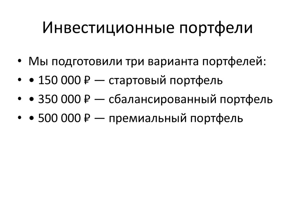 Инвестиционные портфели• Мы подготовили три варианта портфелей: