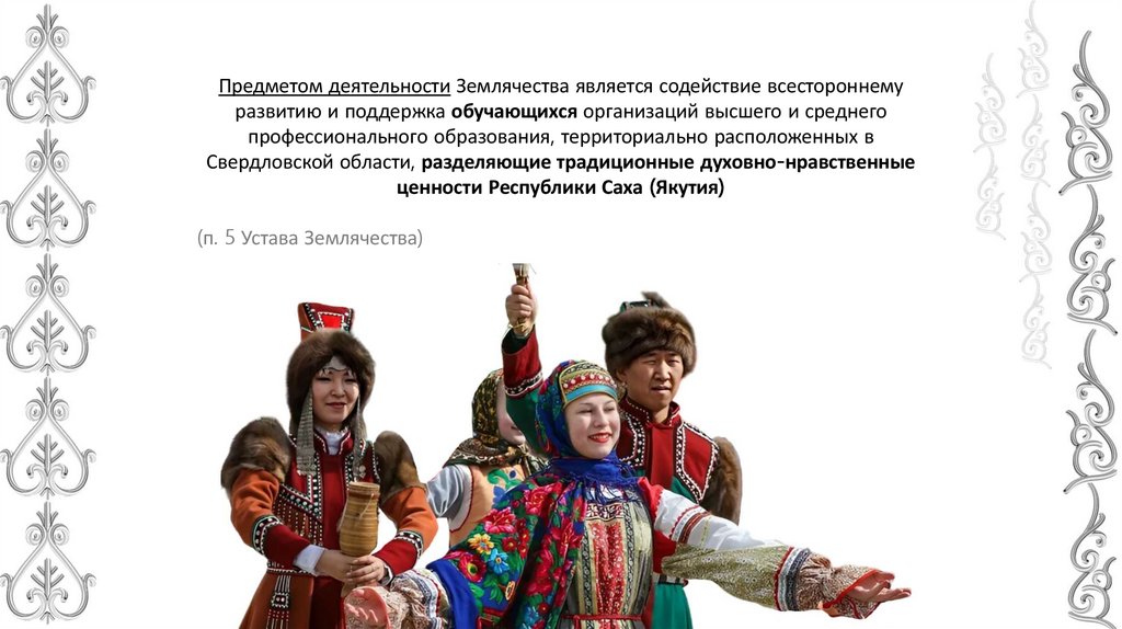 Предметом деятельности Землячества является содействие всестороннемуразвитию и поддержка обучающихся организаций высшего и среднего