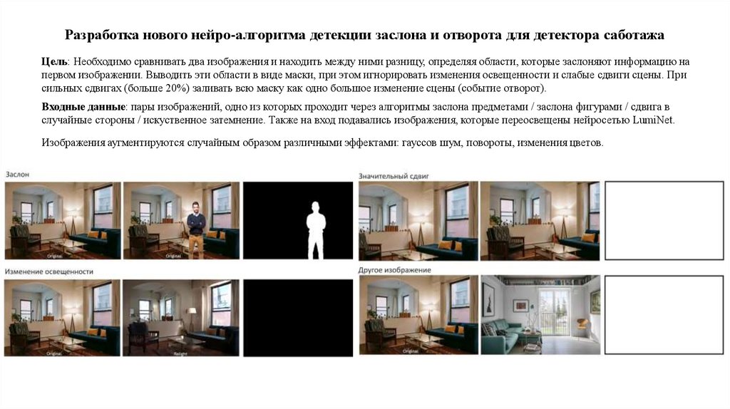 Разработка нового нейро-алгоритма детекции заслона и отворота для детектора саботажаЦель: Необходимо сравнивать два изображения и находить между ними разницу, определяя области, которые заслоняют информацию на