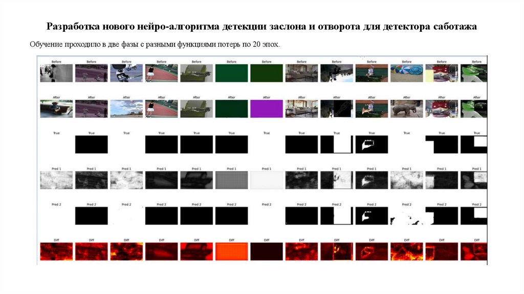 Разработка нового нейро-алгоритма детекции заслона и отворота для детектора саботажаОбучение проходило в две фазы с разными функциями потерь по 20 эпох.
