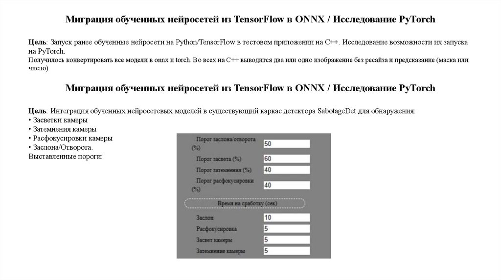 Миграция обученных нейросетей из TensorFlow в ONNX / Исследование PyTorchЦель: Запуск ранее обученные нейросети на Python/TensorFlow в тестовом приложении на C++. Исследование возможности их запуска