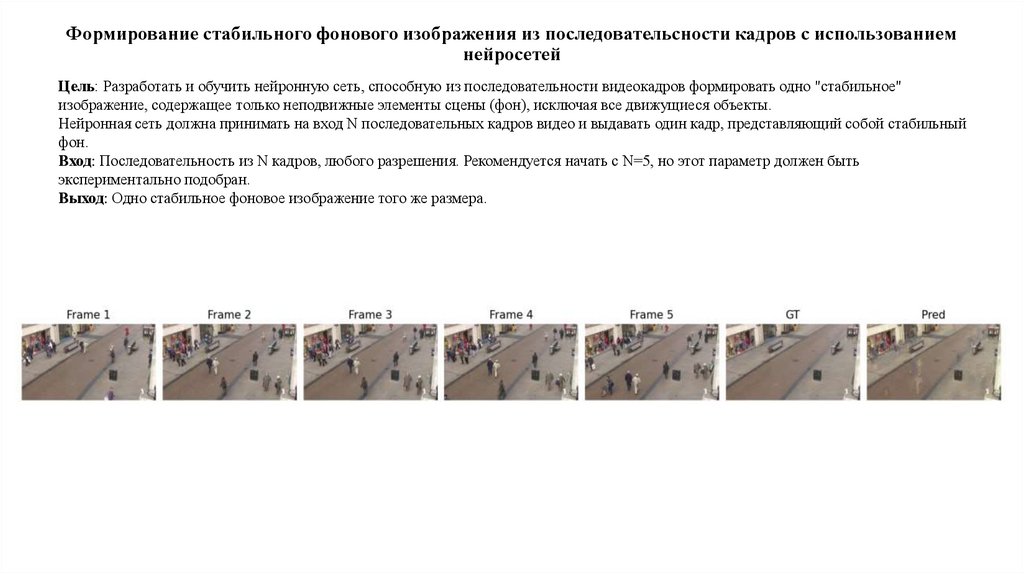Цель: Разработать и обучить нейронную сеть, способную из последовательности видеокадров формировать одно "стабильное"