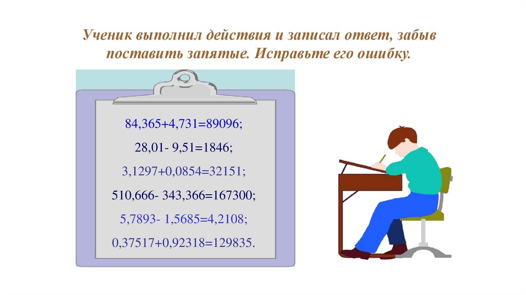 Ученик выполнил действия и записал ответ, забывпоставить запятые. Исправьте его ошибку.