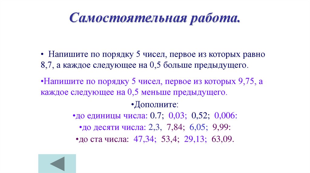 Самостоятельная работа.• Напишите по порядку 5 чисел, первое из которых равно