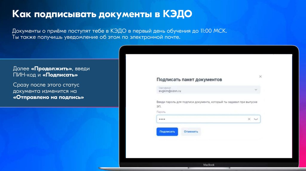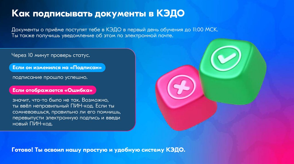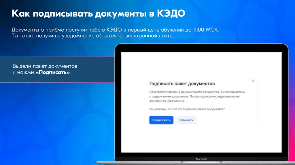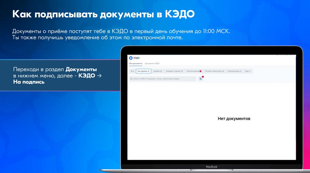 Как подписывать документы в КЭДОДокументы о приёме поступят тебе в КЭДО в первый день обучения до 11:00 МСК.