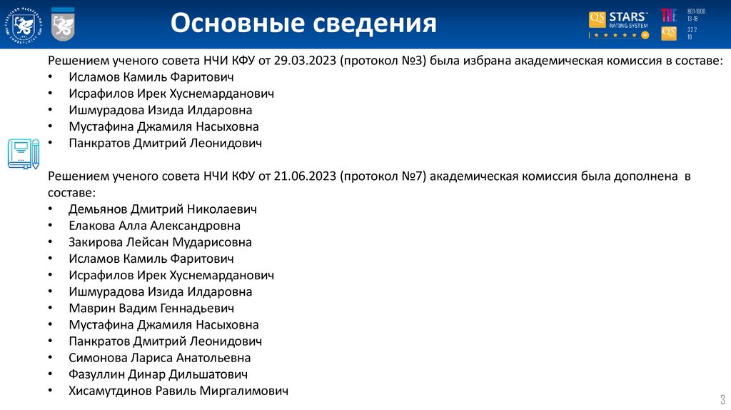 Решением ученого совета НЧИ КФУ от 29.03.2023 (протокол №3) была избрана академическая комиссия в составе: