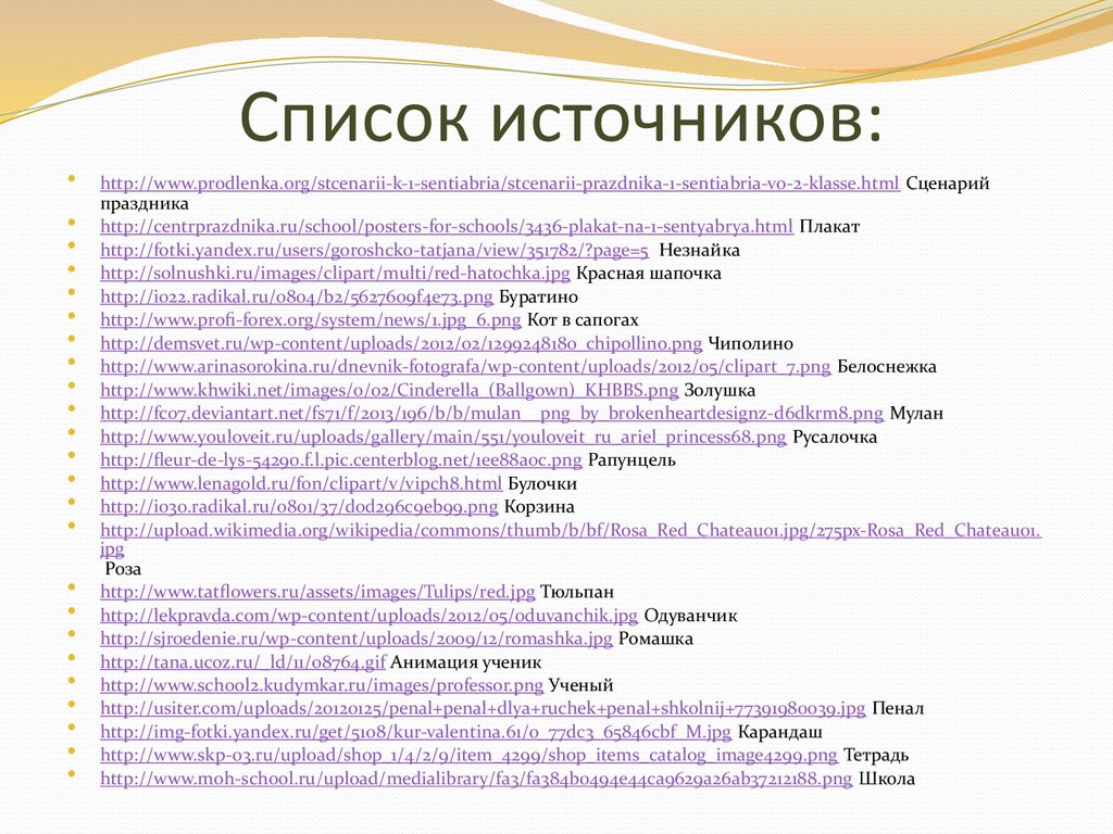 Список источников:http://www.prodlenka.org/stcenarii-k-1-sentiabria/stcenarii-prazdnika-1-sentiabria-vo-2-klasse.html Сценарий