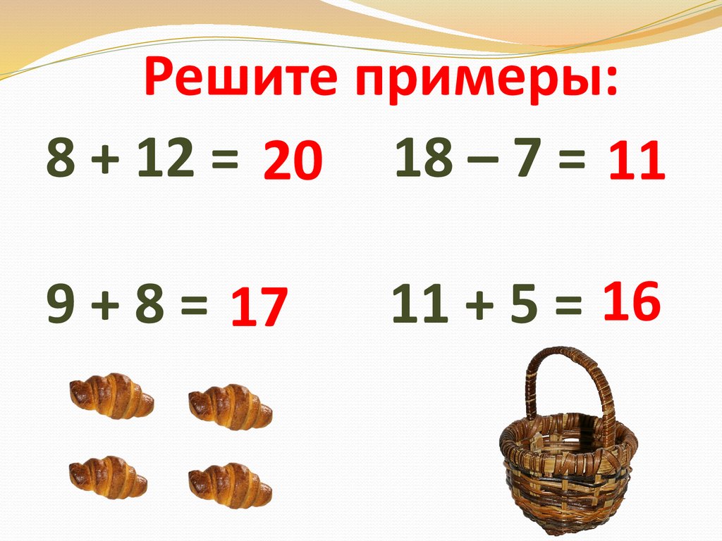 Решите примеры:8 + 12 = 20 18 – 7 = 11