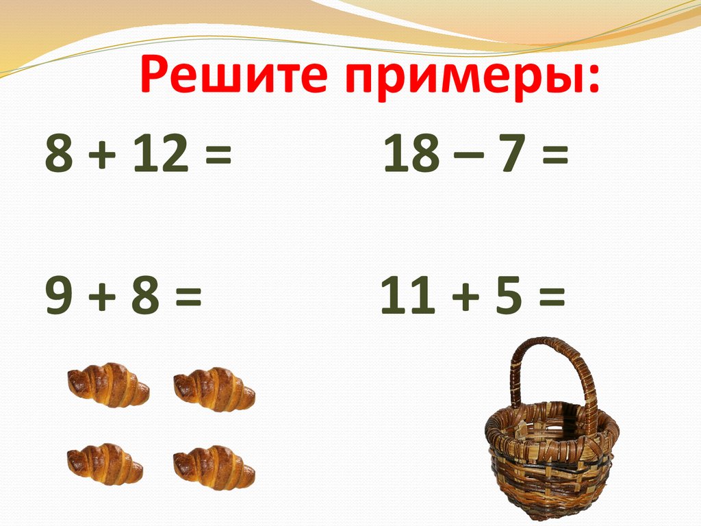 Решите примеры:8 + 12 = 20 18 – 7 = 11