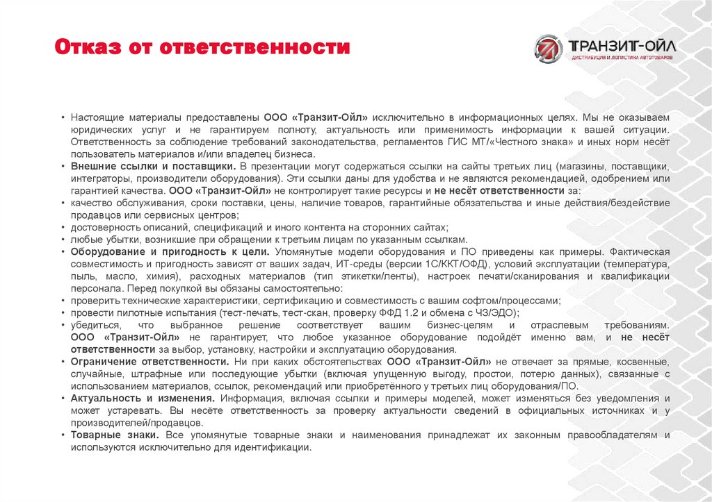 • Ограничение ответственности. Ни при каких обстоятельствах ООО «Транзит-Ойл» не отвечает за прямые, косвенные,