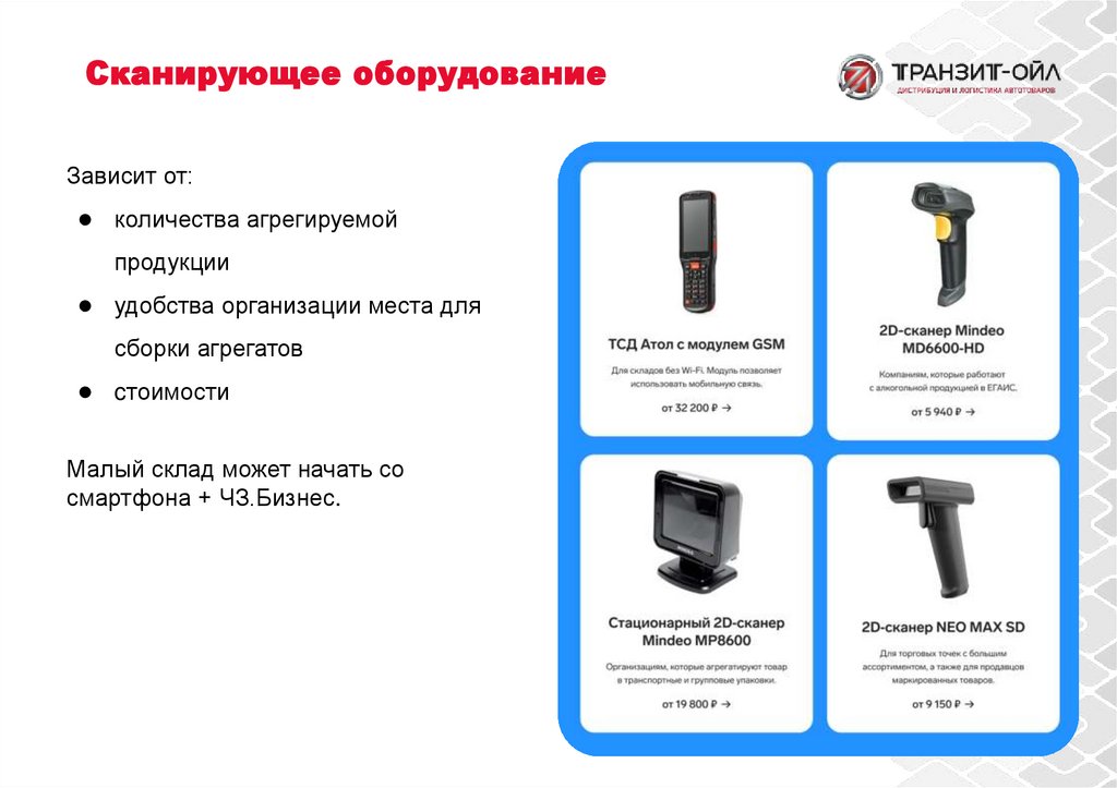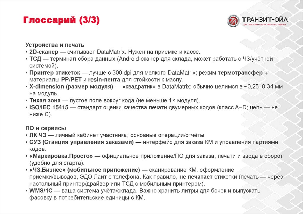 • ТСД — терминал сбора данных (Android-сканер для склада, может работать с ЧЗ/учётной