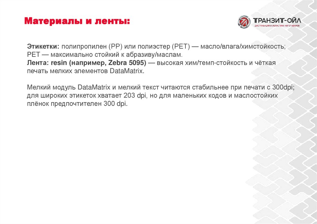 4. Печатаем DataMatrix на подходящем принтере (желательно 300 dpi) на PP/PETэтикетках с resin-лентой — для стойкости к маслу. Соблюдаем размер модуля и