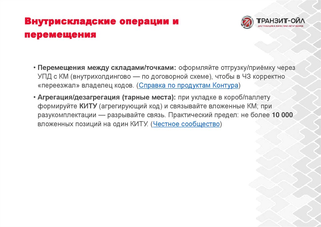 УПД с КМ (внутрихолдингово — по договорной схеме), чтобы в ЧЗ корректно