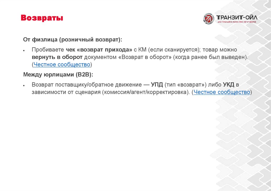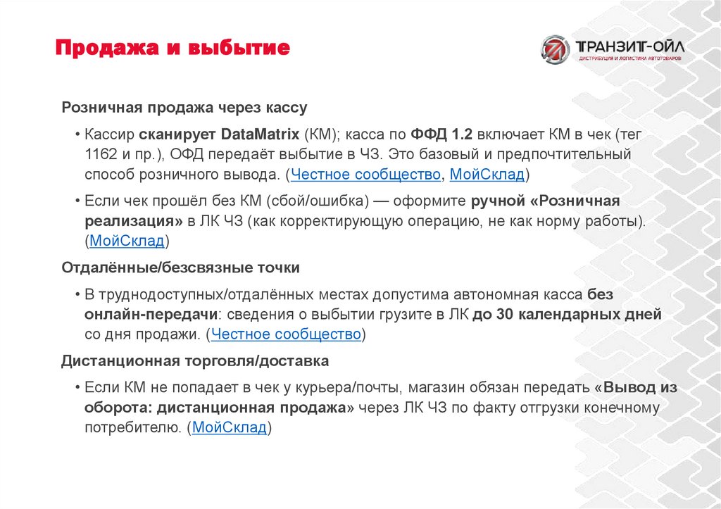 • Если КМ не попадает в чек у курьера/почты, магазин обязан передать «Вывод из