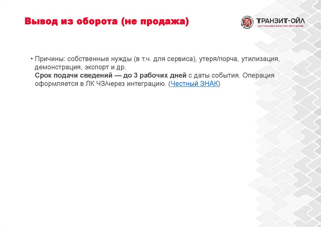 Вывод из оборота (не продажа)• Причины: собственные нужды (в т.ч. для сервиса), утеря/порча, утилизация,